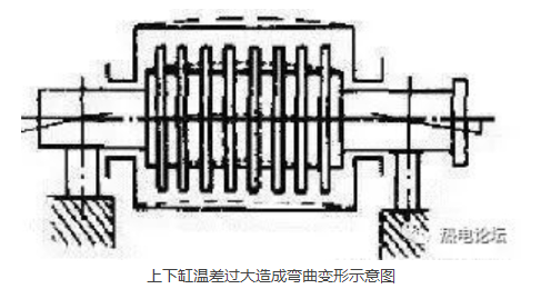 当汽轮机启动与停机时,汽缸的上半部温度比下半部温度高,温差会造成汽轮机汽缸的变形,引起汽缸向上拱起,发生热翘曲变形,俗称“猫拱背”,轻则破坏汽机结合面的严密性,导致漏汽,重则致使动、静部分间隙变小,导致动静摩擦,另外缸体变形会使轴承中心发生变化,使机组发生剧烈振动。